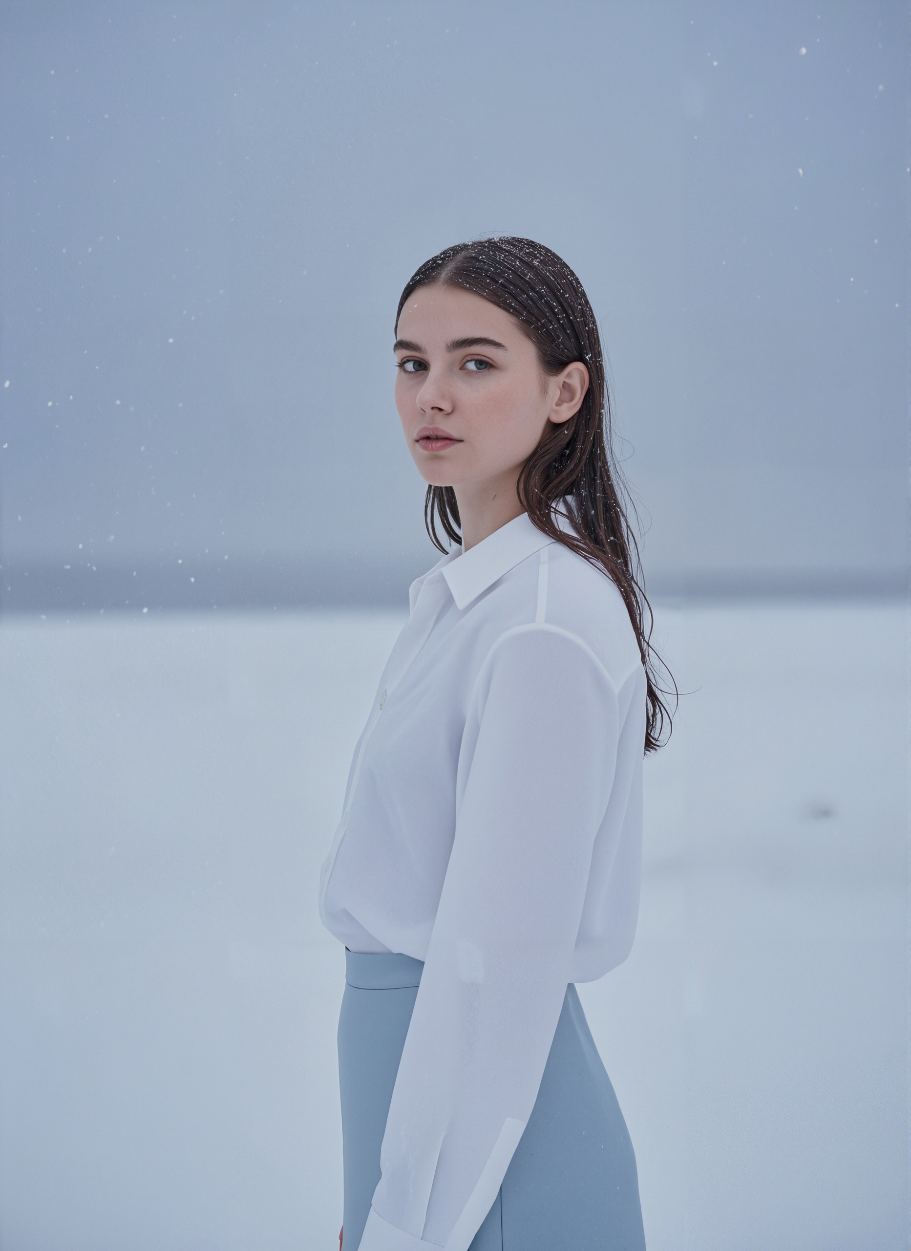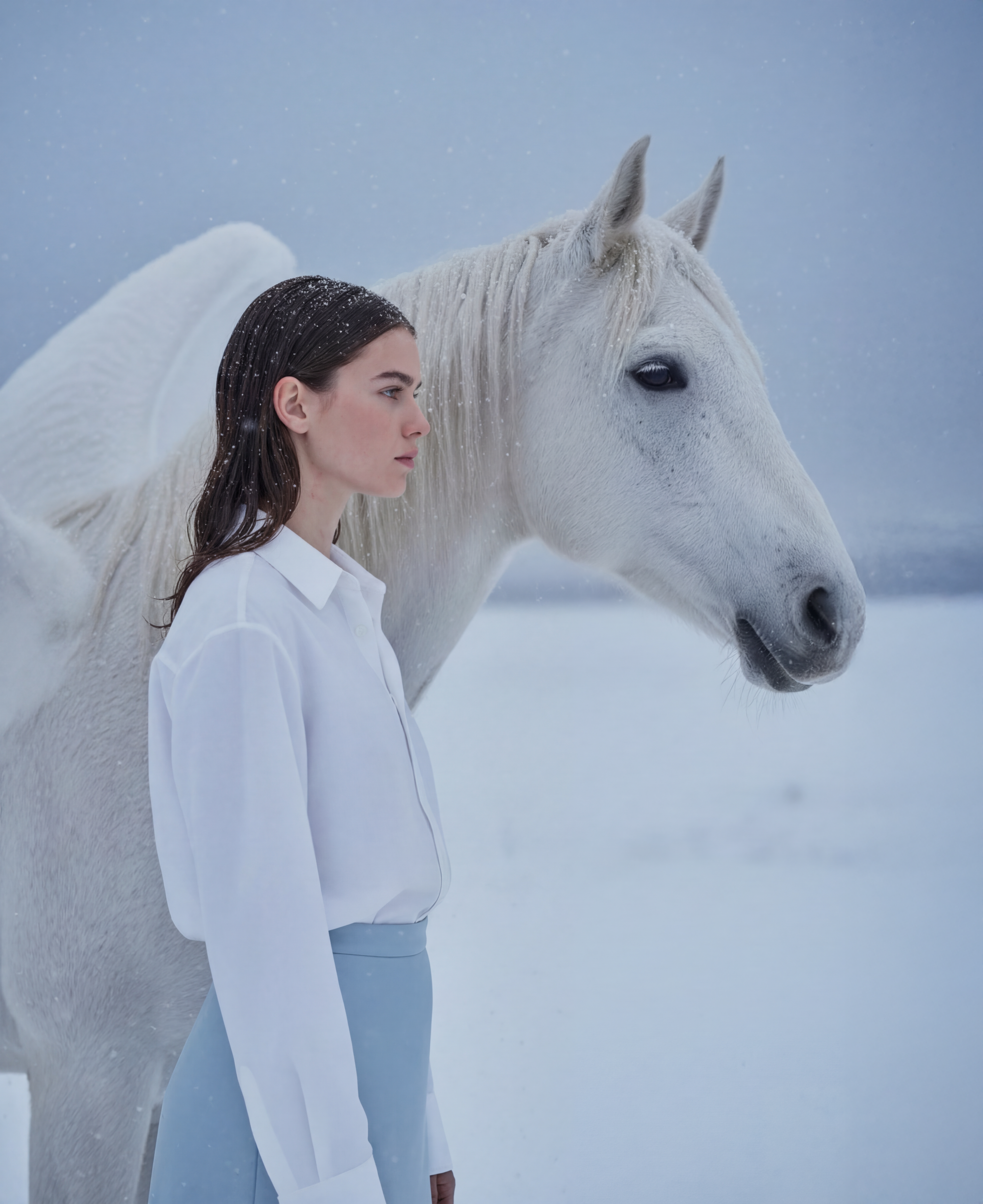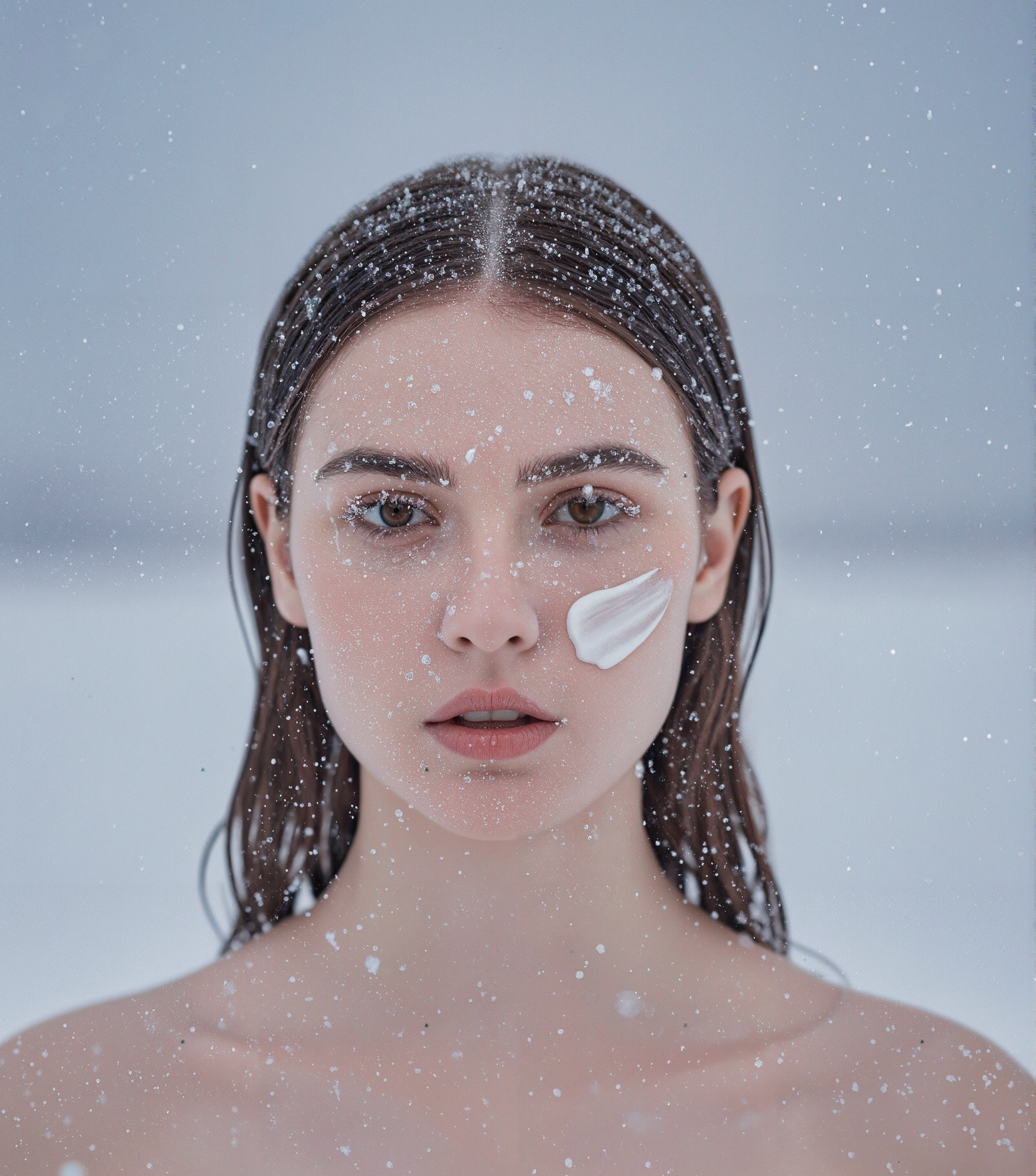 Inspired by purity, protection, and elevation, this universe was conceived as a dreamlike, editorial, and emotional visual narrative — where skin remains untouched, even in the harshness of winter.